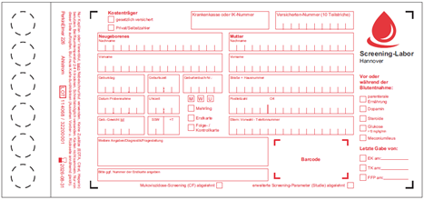 Alle Einsender werden mit den neuen Trockenblutkarten versorgt, die aus einer Kombination eines Filterpapierstreifens und einem Einsendeschein bestehen (siehe Abb.). Zugleich stellen wir Ihnen für jeden Einsender personalisierte Etiketten-Formulare zur Verfügung, die auch zur Dokumentation, z.B. als Geburtenbuch, verwendet werden können.